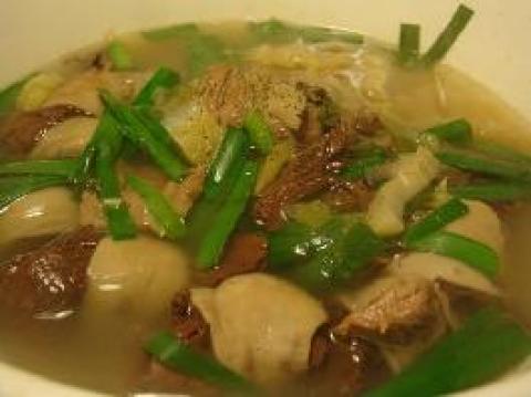 3.先取血肠,和肝连肉剪成小段装碗,依序再加入生韭菜段,生酸菜丁,再淋上热汤后撒胡椒粉即可.