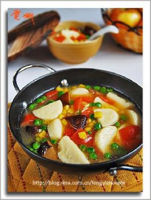 玉子蛋豆腐1条,香菇4朵,西红柿1只,豌豆1把,玉米粒适量