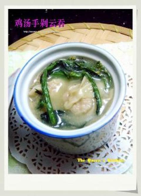 鸡汤,油,青菜,云吞,盐少许,麻油
