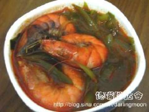 2.热锅倒入少许色拉油,待油温稍热时,放入姜丝煸炒至出香味,然后放入处理好的大虾,放入少量酱油翻炒,至虾身呈红色,再放入海带丝,翻炒一下,加入热水,加入少量盐,煮十分钟左右,即可