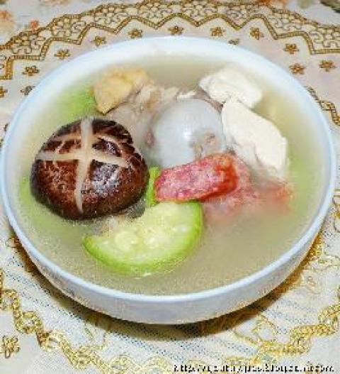 猪骨,咸鱼,腊肠,葫芦瓜,冻豆腐,泡发香菇,姜片,葱
