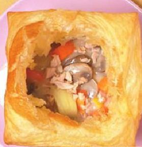 5.当作法4降温至不烫手后,盖上酥皮并在表面以刷子刷上蛋黄液,移入预热好的烤箱以200℃烤约15分钟即可。