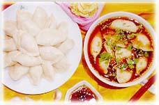 3.锅内放入煮肉汤,汤开放入饺子,煮熟后捞出,加入牛肉丝、辣椒汁、芝麻面、芝麻油,另外还要倒入各种调料调好的原汤。