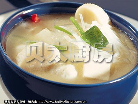先放鱼丸和豆腐炖10分钟,再放带子肉和粉丝炖6分钟,最后放裙带菜煮1分钟。上桌前撒香葱末即可。