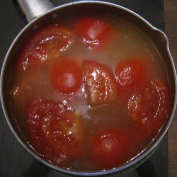 4、往锅中倒入番茄翻炒几下,放半汤匙白糖,反复煸炒出沙起糊,倒一大碗水,煮开加盖转小火炖20~30分钟左右成番茄浓汤。