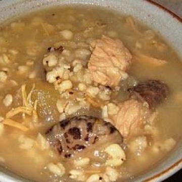 小冬瓜半个,冬菇6只浸软,去蒂,切半,干贝3颗,浸软,搓成丝,薏米一把,排骨或瘦肉半斤,陈皮2块,浸软去囊,盐适量,调味用