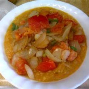 3.炒锅放中火上,倒入一半量的植物油预热。加洋葱,炒至淡黄色,约1-2分钟。炒入番茄,青辣椒,盐和胡椒粉。继续炒3至5分钟。加入另一半的油,小扁豆泥和红薯泥,炒匀。根据需要加适量的水以达到理想的稠度。继续煮至汤变稠,内容物融合即好。用香菜或小葱调味点缀,趁热吃。