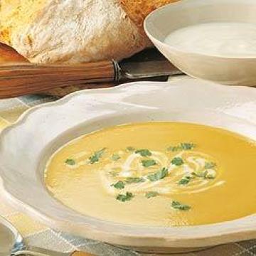 7.汤舀到碗中,用香菜叶点缀。准备一碟酸乳酪,由用餐者自取。