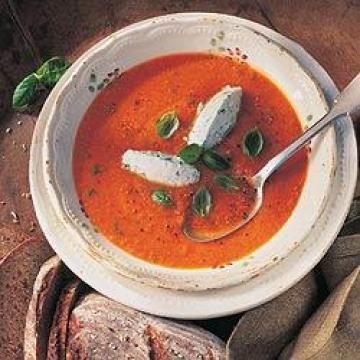 5.用食物调理机或搅拌机将汤调成糊状,加盐、胡椒调味。上桌时,放几匙掺了罗勒叶丝的奶油乳酪,用罗勒叶点缀。