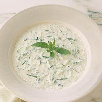 大胡瓜(黄瓜)1根,多叶薄荷4枝,原味酸乳酪500克,一次分离稀奶油150毫升,白葡萄酒醋2汤匙,盐、黑胡椒适量,点缀:,薄荷4小枝,配菜:,冰块(不用亦可)