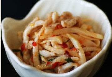 为酸汤鳕鱼面配了三样小菜酸辣笋丝炒肉,柠檬黄瓜条,水晶鱼糕鸡冻