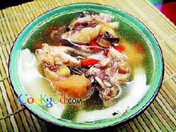 (2)、把炒锅置武火上烧热,放入素油,烧至六成热时,下入姜、葱炒香,放入兔肉、核桃仁、杜仲粉、西芹、盐炒匀,加入鸡汤,用武火烧沸,再用文火煲35分钟即可食用。