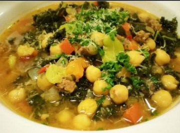 - 加kale煮软, 加蚕豆, 鹰嘴豆煮入味, 加盐,胡椒调味, 撇掉浮油, 去掉香叶