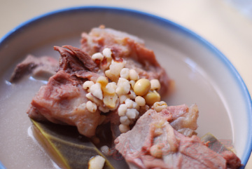 2、将切好的大蕉、猪骨和眉豆、茨实、薏米一齐放煲内,加入清水大火煲滚后转中火煲约两小小时,放盐调味后便可饮用。