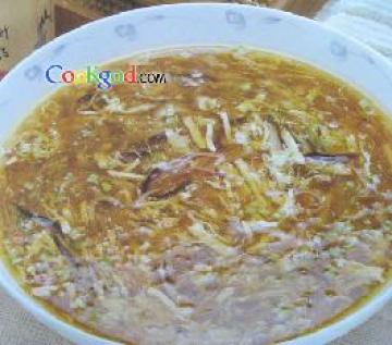 2、将猪瘦肉切成细丝汆熟,与豆腐丝、冬菇丝、海参丝、鱿鱼丝一起放入锅内,加鸡汤、盐、酱油用旺火烧沸,去浮沫,用湿淀粉勾芡,加打散的鸡蛋液制成汤。