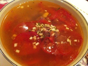 5、向锅里加入适量水,放入大蒜、生姜熬汤,至水沸腾后加入西红柿,沸腾3分钟,至中火倒入肉丸。