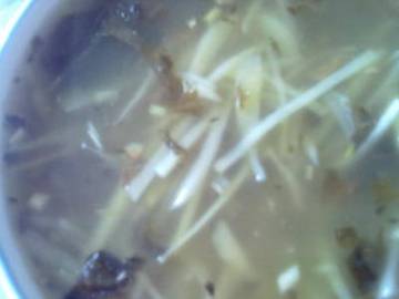 3、锅中烧热加油,放盐菜少许翻炒后加适量水烧开,再加入土豆丝,放胡椒粉和盐少许。