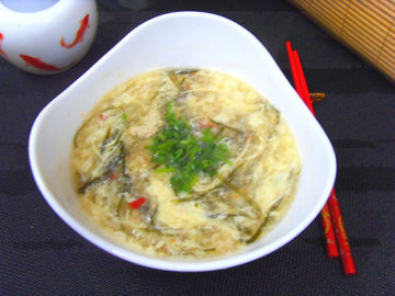 1. 鲜海带泡了一夜,咸味已经泡没了,切细丝。 2. 千丈皮,切细丝。 3. 生姜、葱叶、辣椒酱、白胡椒粉准备好。 4. 海带丝与生姜丝煮时间长一点,用高汤煮(排骨汤、鸡汤都可以)。 5. 海带煮了约1、2十分钟后,下千丈丝(下了千丈丝以后不能煮太~久,会碎的)。 6. 加少许盐、煮开。 7. 后加葛根粉和成的水(淀粉、玉米粉都行)等着汤开的同时准备下一步。 8. 鸡蛋在汤碗里搅拌好。 9. 汤烧开了,用勺子朝一个方向画圈,放辣椒酱,再向一个方向搅几下(搅拌要快时间短、快,防止汤泄掉)。 10. 汤烧开后,用开的汤去冲汤碗里的蛋液,冲下去以后,立即用勺子向一个方向画圈搅拌约3、4下。 11. 放白胡椒粉。 12. 撒上葱花和香菜,ok。