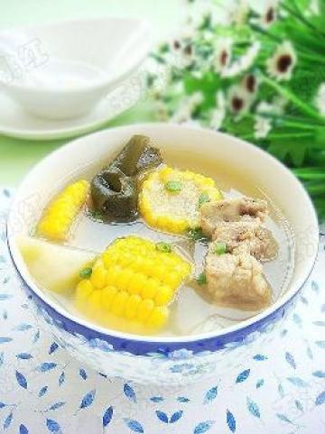 5、加入海带结、切块的白萝卜和玉米再炖半小时,加入盐即可。