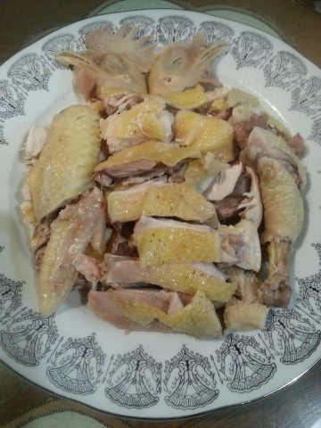 1、锅中烧水,放入整只鸡,加姜片、葱段和料酒,大火滚20分钟至无血水,捞出浸入冰水,冷却后斩段。
