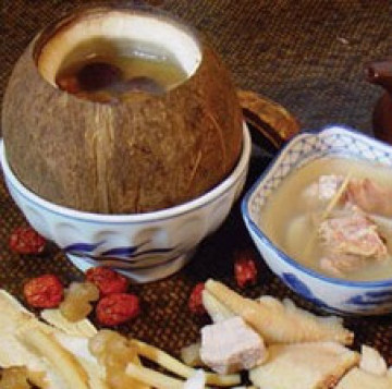 4.将煮好的浓汤倒入椰子壳中即可使用