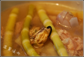 3、将笋和淡菜干加入筒骨一起上煲锅,煲2.5-3小时。