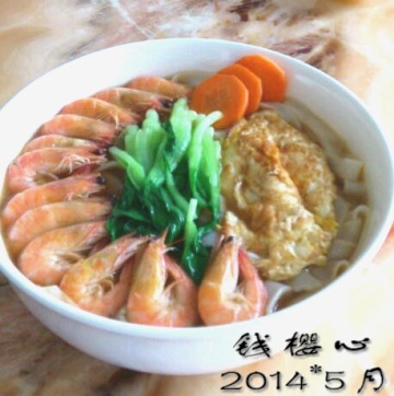 拉面150公克,海鲜汤头500㏄,虾1只,蚵5颗,鱿鱼3片,鱼板2片,金针菇20公克,盐1/2茶匙