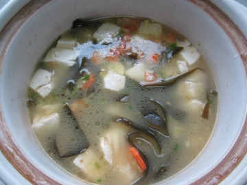 2.锅内放入开水,加豆腐丁、海带丝、葱花;