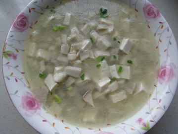 11.下豆腐煮开,即可盛汤碗内,放入芫荽即成。