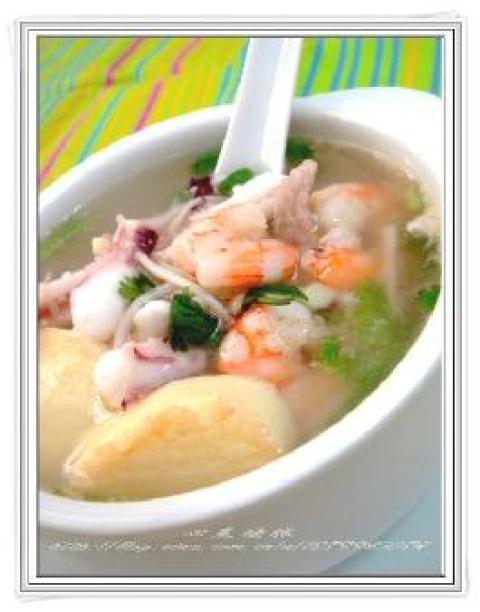 2.将鱿鱼片、虾仁、石斑鱼片放入滚水中汆烫约1分钟后捞起备用。