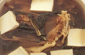 4.将煎香的豆腐、鱼头与大蒜一起放入锅内,加清水适量,文火煲半小时,加入盐、味精调味供用。