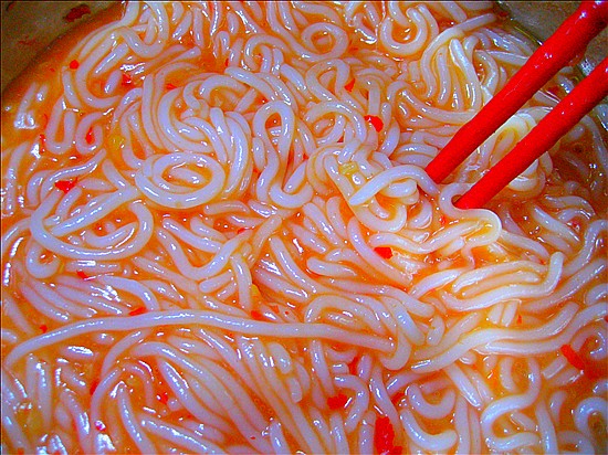 4、等酱料做好,也差不多米粉煮好了。用漏斗吧米粉撩出来。撩干。