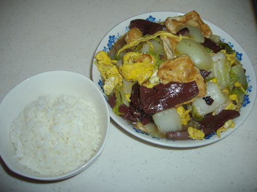 及以下步骤:猪血双面煎至有微微的糊嘎。(我用了平底锅煎,因为猪血太容易散了) 锅内放适量油,温油下葱花爆香后放入事先接好的白菜。 猪血双面煎至有微微的糊嘎。(我用了平底锅煎,因为猪血太容易散了) 锅内放适量油,温油下葱花爆香后放入事先接好的白菜。 1.红、白豆腐切方形片,白菜方块,葱切花; 猪血双面煎至有微微的糊嘎。(我用了平底锅煎,因为猪血太容易散了) 锅内放适量油,温油下葱花爆香后放入事先接好的白菜。 白菜翻炒半分钟后加盖焖煮一会儿,至白菜略微出水。 加入事先煎好的红、白豆腐,稍稍翻炒。(动作要慢,猪血太容易散,否则你吃到的就是猪血渣了) 加入事先炒好的鸡蛋,翻炒几下;调入盐(视菜量而定)再翻炒均匀即可。