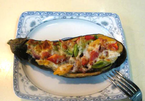 及以下步骤:把炒好的意粉和什锦蔬菜醸入茄壳儿中,上面放上彩椒丁,然后,用手把奶酪撕碎均匀的洒在表面即可。 把醸好的茄壳儿置入烤盘。 烤箱调到250℃,预热3分钟,然后调到200℃,把醸好的茄子放入烤箱,烤20分钟就ok了。 锅烧水,水沸后放入少许盐,下入意面(通心粉),煮8分钟捞出备用。 另起锅,放入6克橄榄油,放入5克黄油,黄油溶后下入事先切好的蒜粒煸炒。 蒜煸出香味后,先放入洋葱再放入茄丁,煸出香味后下入白蘑菇,最后放入番茄丁,5分钟后用黑胡椒、盐调味。 下入煮好的意粉继续煸炒,两分钟后出锅。 把炒好的意粉和什锦蔬菜醸入茄壳儿中,上面放上彩椒丁,然后,用手把奶酪撕碎均匀的洒在表面即可。 把醸好的茄壳儿置入烤盘。 烤箱调到250℃,预热3分钟,然后调到200℃,把醸好的茄子放入烤箱,烤20分钟就ok了。