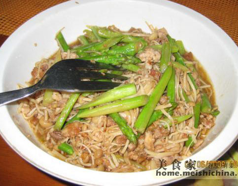 2、炒到有点焦焦的,在放入金针菇和芦笋,调味,稍微焖煮一小会儿就行了。
