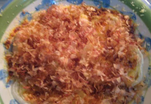 4、趁热撒上柴鱼片,滴上几滴酱油(不滴也可以,随个人喜好),就可以开动了。