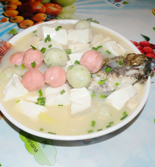 及以下步骤:鱼清洗净擦干(鱼肚子里面那层黑膜很腥要刷掉),小葱打结,大葱,姜切好。 用块姜在锅里抹一遍(据说防止粘锅)。 鱼清洗净擦干(鱼肚子里面那层黑膜很腥要刷掉),小葱打结,大葱,姜切好。 用块姜在锅里抹一遍(据说防止粘锅)。 鱼清洗净擦干(鱼肚子里面那层黑膜很腥要刷掉),小葱打结,大葱,姜切好。 用块姜在锅里抹一遍(据说防止粘锅)。 锅里放油爆香姜片放鱼用中火两面煎黄,把鱼推到锅的一边,放大葱爆香。 之后加入水没过鱼,放葱结, 大火煮开转中煮10多分钟(汤出奶白色)。 放丸子继续煮10分钟。 放入豆腐和盐中火再煮3-5分钟即可,小心别把豆腐煮坏了。