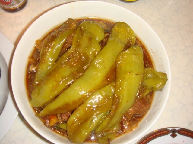 3、牛肉炖一个半小时,辣椒正反面煎下,(起泡就好) 放到牛肉里面。再炖半小时。成功。
