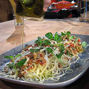 5、煮熟意面后点几滴橄榄油拌匀。加酱,放牛至叶和干酪在顶部后可食用。