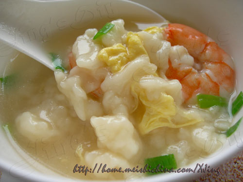 及以下步骤:锅里加水烧开后放虾仁煮一下。 水再次煮开时,就可以把筛好的面疙瘩下锅了。 要用饭勺不断的搅动,以免粘在锅底上。 煮好后,在把鸡蛋液倒入锅中,稍停一会,用饭勺搅动一下,鸡蛋就会成片状,这时候加入海鲜酱油烧开,然后关火。 关火后加盐、油、最后加上绿色蔬菜,这里我用的是橄榄油,大约不超过1克,很清爽。 做好的疙瘩汤。 感觉像瓷器吧。 来张特写。 感觉像瓷器吧。 来张特写。