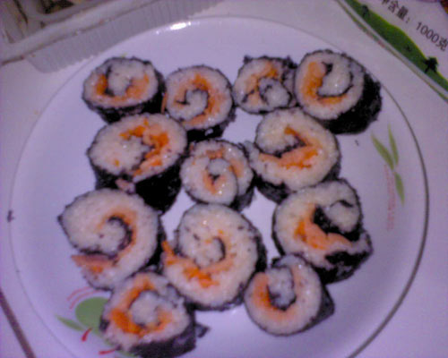 网上已经有很多寿司的做法了,我们也看过好多种不同的饭团做法,但是我们自己制作还得根据自己家里已有的原料,和现有的做菜心情,来制作美味!愉悦的心情是菜品是否合胃口的最佳调味品。由于回娘家,没带相机,是用手机拍摄的,效果不太好!