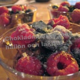 蛋清(2个) / 砂糖(1汤匙) / 可可(适量) / 罐装奶油(3分升) / 新鲜覆盆子(1分升) / 甘草糖果(10件)