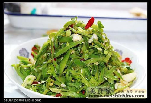及以下步骤:看很棒吧。 梅豆洗净。 切成细丝。 梅豆洗净。 切成细丝。 放入煮开的水里烫熟。(必须要烫熟,烫不熟的梅豆有毒) 烫好后放入冷水里冰一会。 准备好小料。 加入小料,醋,香油,盐,味精拌好。 看很棒吧。