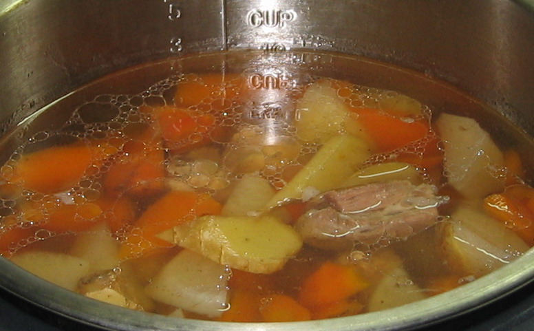 5、将羊排、切成滚刀菱形状的红、白罗卜、生姜(切片)、花椒、葱(长段)、白酒一并放入高压锅,加盖炖至30分钟。