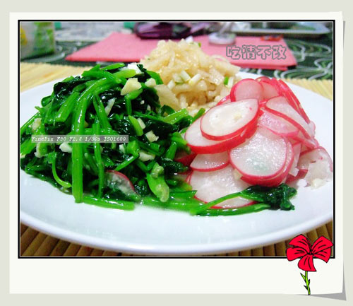 5、菠菜焯水后过凉水,加蒜末,盐,鸡精,香油,熟芝麻,少许醋拌匀;梨丝加白糖,香油少许,醋少许,香葱末拌匀;腌过的萝卜片挤去汤汁,加香葱拌匀;最后就是把这些分别拌好的东东放在一个大盘子里就好啦。
