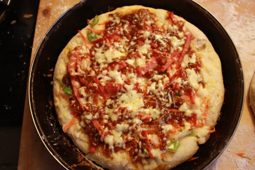 4、将发好的面赶成薄饼,上面撒上已成蔬菜,胡萝卜,青椒丁、洋葱丁、再撒上一层马苏里拉芝士、上面再将火腿细条撒在上面。再撒上一些马苏里拉(切忌少撒)在烤制过程中还要撒一次马苏里拉芝士。烤箱180度预热,烤制20分钟即可,15分钟时,取出,上面撒上一层马苏里拉芝士,香美的披萨就完成了。满足了我想去必胜客的冲动,呵呵!