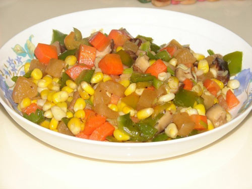 冬菇切粒(5-10朵) / 玉米剥粒(1条) / 青椒切粒(1-2个) / 菜圃切粒(10条左右)