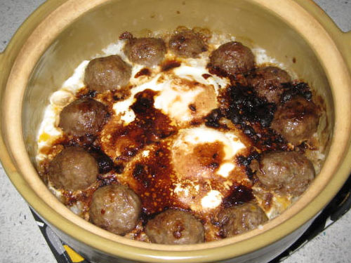 及以下步骤:将牛肉丸对半切开,加入少许油在瓦煲中,将牛肉丸双面稍煎煎。此步骤有两作用:一是令牛肉丸更加香脆;二则可使煲面留下一层油,避免米饭粘黏。 先将米浸泡30分钟。 将牛肉丸对半切开,加入少许油在瓦煲中,将牛肉丸双面稍煎煎。此步骤有两作用:一是令牛肉丸更加香脆;二则可使煲面留下一层油,避免米饭粘黏。 先将米浸泡30分钟。 将牛肉丸对半切开,加入少许油在瓦煲中,将牛肉丸双面稍煎煎。此步骤有两作用:一是令牛肉丸更加香脆;二则可使煲面留下一层油,避免米饭粘黏。 先将米浸泡30分钟。 将牛肉丸对半切开,加入少许油在瓦煲中,将牛肉丸双面稍煎煎。此步骤有两作用:一是令牛肉丸更加香脆;二则可使煲面留下一层油,避免米饭粘黏。 将蚝油,酱油,麻油,辣酱混和成汁,把煎香的牛肉丸泡入其中。 将泡好的米放入煲中,加入适量的水.米和水的比例约是1:1.5;大火煮开,后改中火煮至八成熟(在煮的过程中需不断拿筷子搅拌大米,使其受热均匀),加进入味的牛肉丸和两鸡蛋,改小火,加盖焖煮三至五分钟。 然后关火,加入余剩的酱汁,无火加盖再焖10分钟即可。