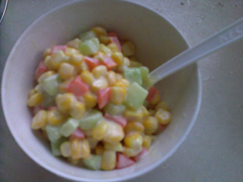 及以下步骤:我用的鹰唛炼奶,家乐的清淡沙拉酱,三勺沙拉酱,三勺炼奶,最好是1:1搅匀。 玉米粒,青瓜丁,胡萝卜丁分别汆水,然后装碟备用。 我用的鹰唛炼奶,家乐的清淡沙拉酱,三勺沙拉酱,三勺炼奶,最好是1:1搅匀。 玉米粒,青瓜丁,胡萝卜丁分别汆水,然后装碟备用。 我用的鹰唛炼奶,家乐的清淡沙拉酱,三勺沙拉酱,三勺炼奶,最好是1:1搅匀。 把玉米粒,青瓜,胡萝卜清洗干净,青瓜和胡萝卜切丁备用。 玉米粒,青瓜丁,胡萝卜丁分别汆水,然后装碟备用。 我用的鹰唛炼奶,家乐的清淡沙拉酱,三勺沙拉酱,三勺炼奶,最好是1:1搅匀。 搅匀后的成品,记住,一定要充分搅拌。 需要吃多少就搅拌多少食材和沙拉酱。全部搅拌了,放太久食材会出水,这样味道淡了就不好吃了。