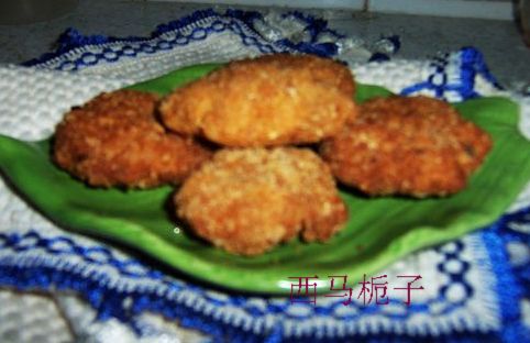 及以下步骤:用勺子弄成丸子压扁,两面沾满面包糠。 炸至两面金黄即可。 鳕鱼去皮。 剁成鱼茸。 加盐、胡椒、鸡精、香油和葱姜碎。 鸡蛋打散。 加入鱼茸里,打上劲。 加淀粉成干糊。 用勺子弄成丸子压扁,两面沾满面包糠。 炸至两面金黄即可。